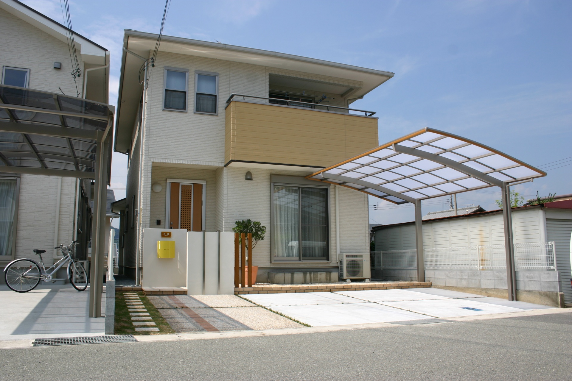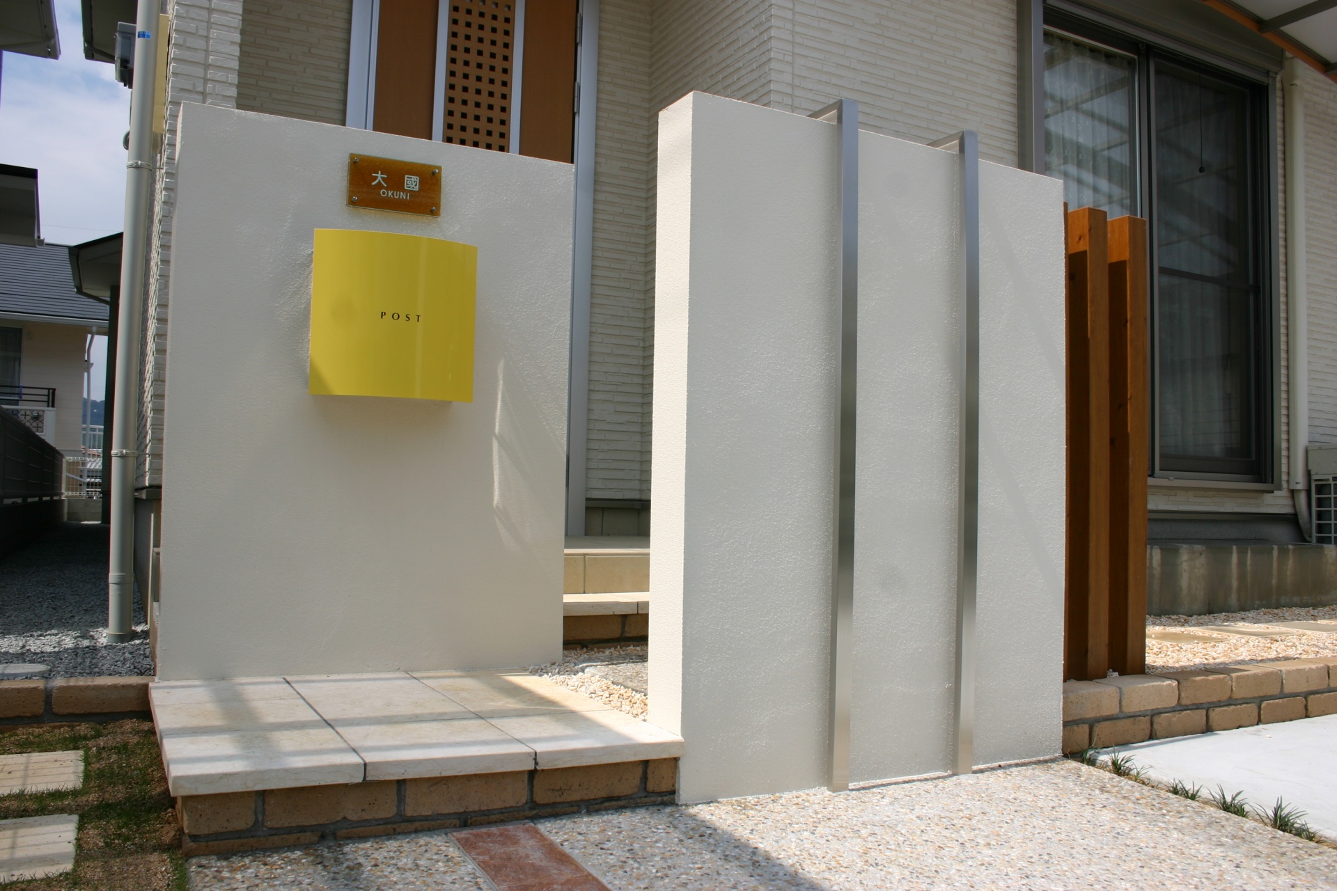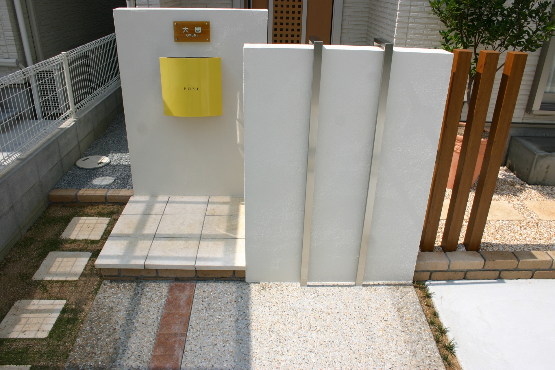 施工実績 相生市新築外構 ライトな木目の外観に爽やかなイエローポスト ライトな色目の玄関扉、バルコニーが優しい雰囲気の相生市O様邸 設計GLより道路までの高低差が350mm程あった為、全体的に勾配を緩くする為に1段土留めを設けました。 門周りは段差を作った為ステップが必要になります。 300□自然石で踏み込みの踊り場を作り、2枚の門袖壁で玄関前を仕切るデザインになりました。 建物の外観に合わせ黄色のデザインポスト、木目のスリットフェンス・カーポートの木目調化粧カバーなどトータルで柔らかい雰囲気のお庭が出来上がりました。 before まっすぐ伸びたタイルラインの先には黄色のデザインポスト。 特注で作成したステンレスバーで片方の門袖壁を囲っています。 モダンなテイストも取り入れています。 お客様の声 梶原さんに家の雰囲気に合うように提案していただいて、 仕上がりも思っていた以上で大変喜んでいます。 家に帰って来るのが楽しみなくらいです。 職人さん方、暑い中 本当にありがとうございました。