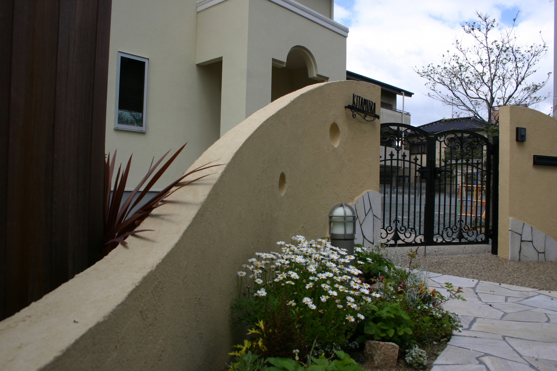 施工実績 播磨町新築外構 アール曲線の門袖壁が可愛いクローズエクステリア 流れるような曲線デザインを門柱にデザインした加古郡K様邸。3次元の曲線の門柱はインパクトがあります。木製スリットフェンスと植栽でナチュラルなイメージに仕上がりました。アクセントのホワイト自然石も上品な印象を与えます。 大胆なアールの門柱。小花の成長が楽しみです。 木製スリットフェンスは斜めからの目隠しに有効的です ホワイトの自然石がナチュラルカラーの門柱によく似合います。