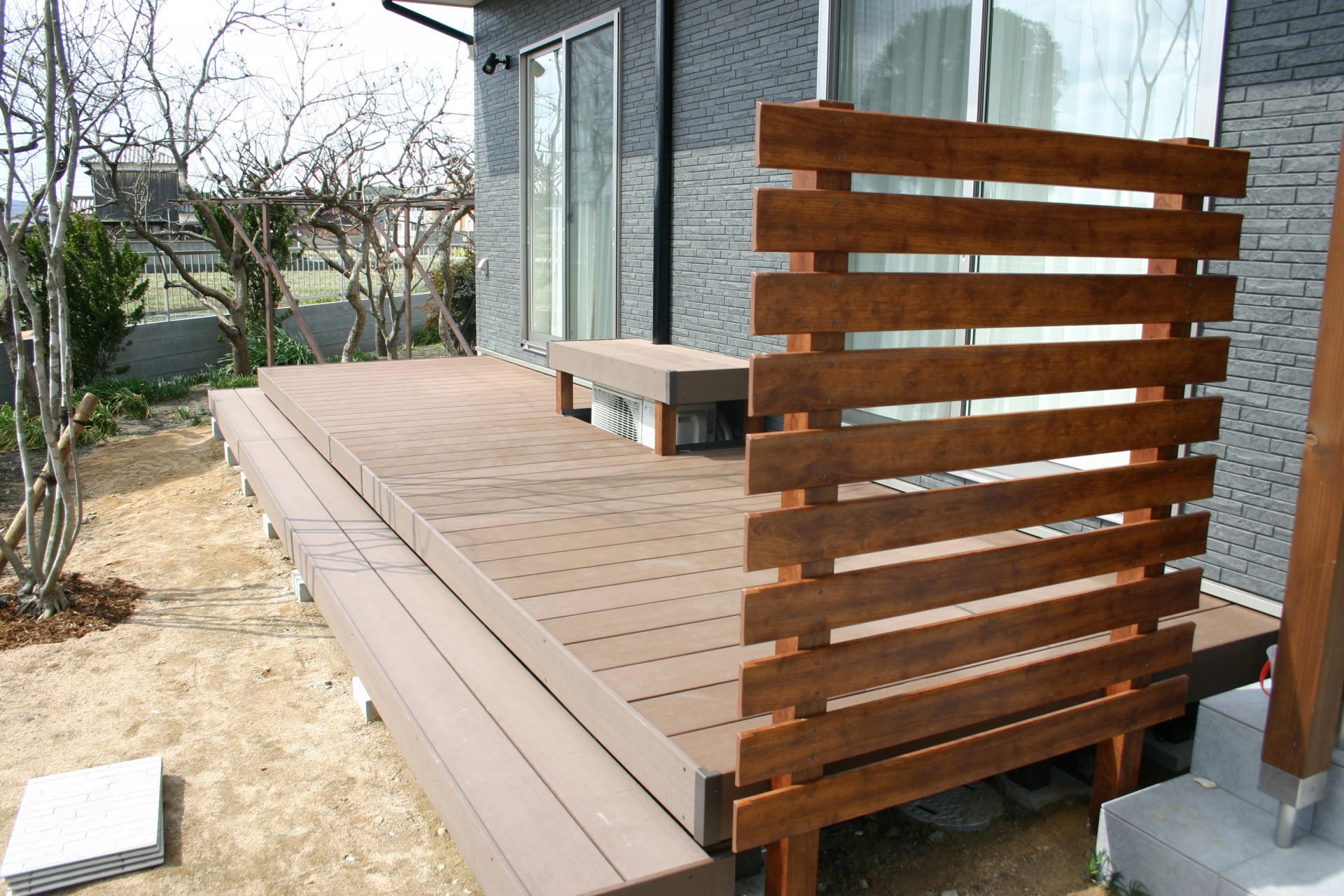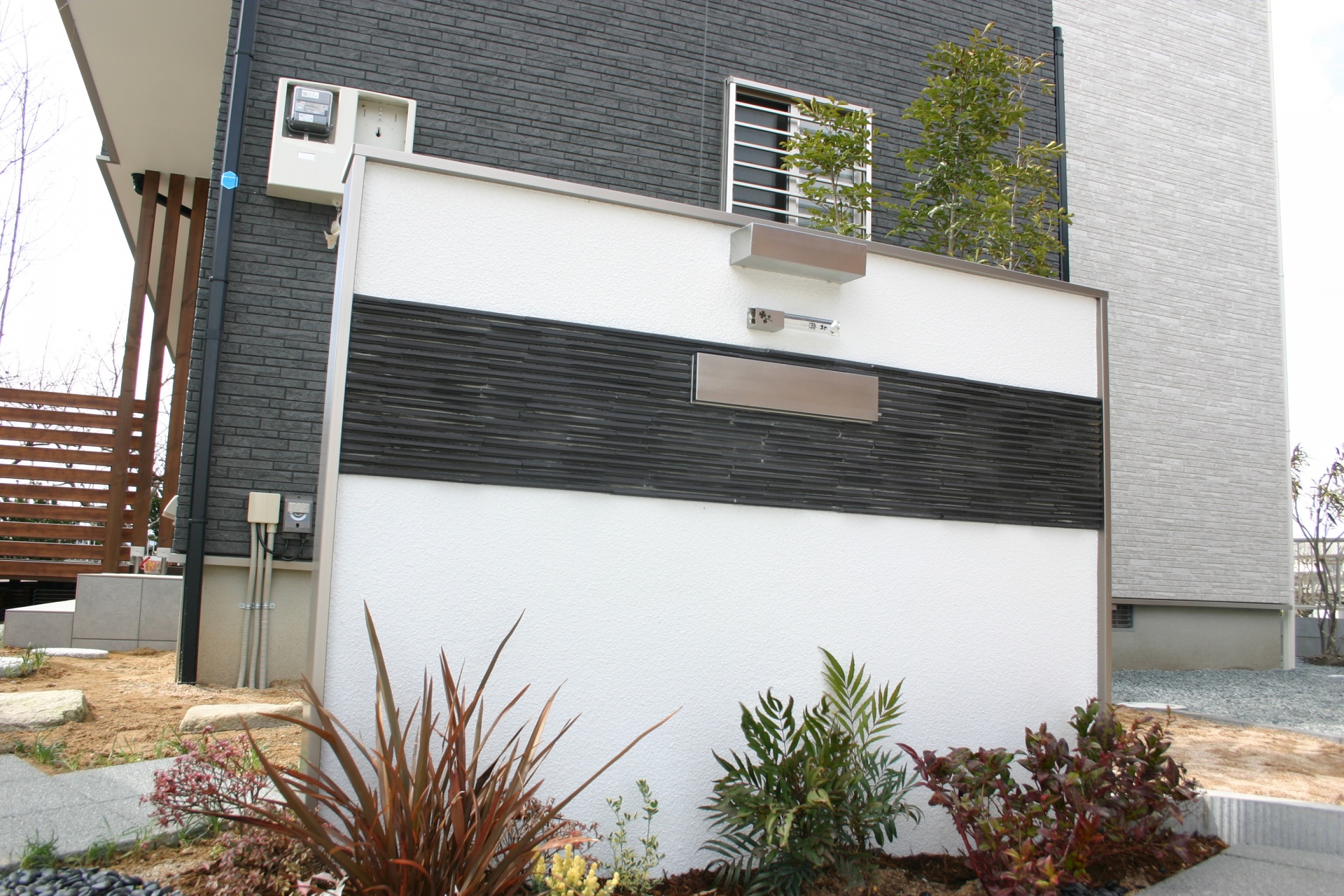 施工実績 たつの市新築外構 ステンカラーと黒系自然石でコーディネイト ホワイトとダークグレーのツートンカラーがポイントのたつの市T様邸。スタイリッシュなカーポートの合掌と門柱設備をステンカラーにてコーディネイトしました。直線のラインを生かしたモノトーンデザインのアプローチがポイントです。 before 青空の下に輝くステンカラーのカーポート。 大型の人工樹脂デッキ。端材を利用した室外機カバー兼ベンチがポイントです。 門柱設備のステンレスでコーディネイトしました。ガラスのスティックサインがポイント モノトーン配色でアプローチをデザイン。透水性で環境にやさしい素材です。