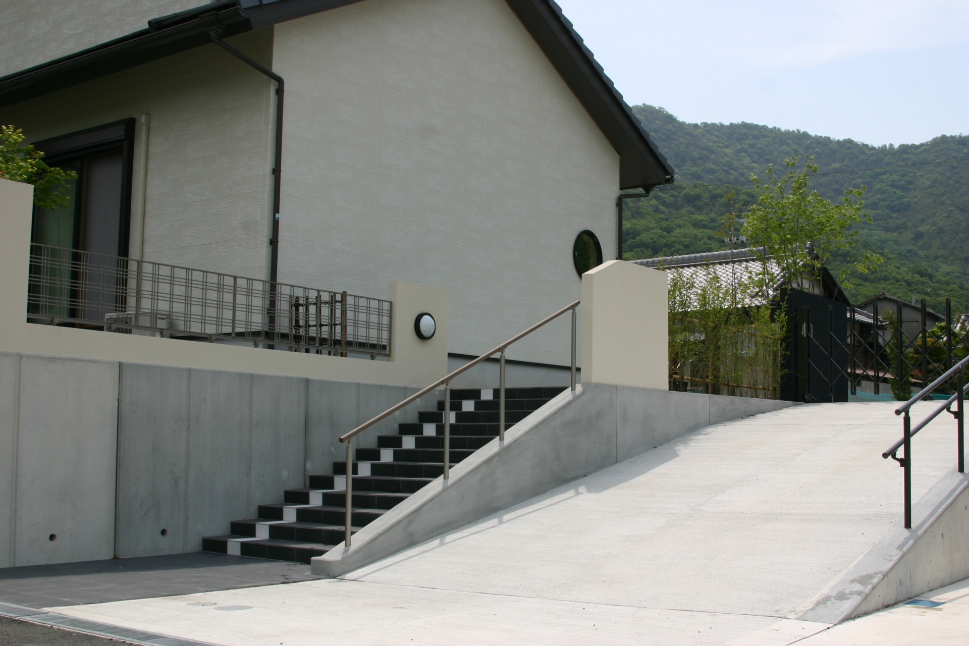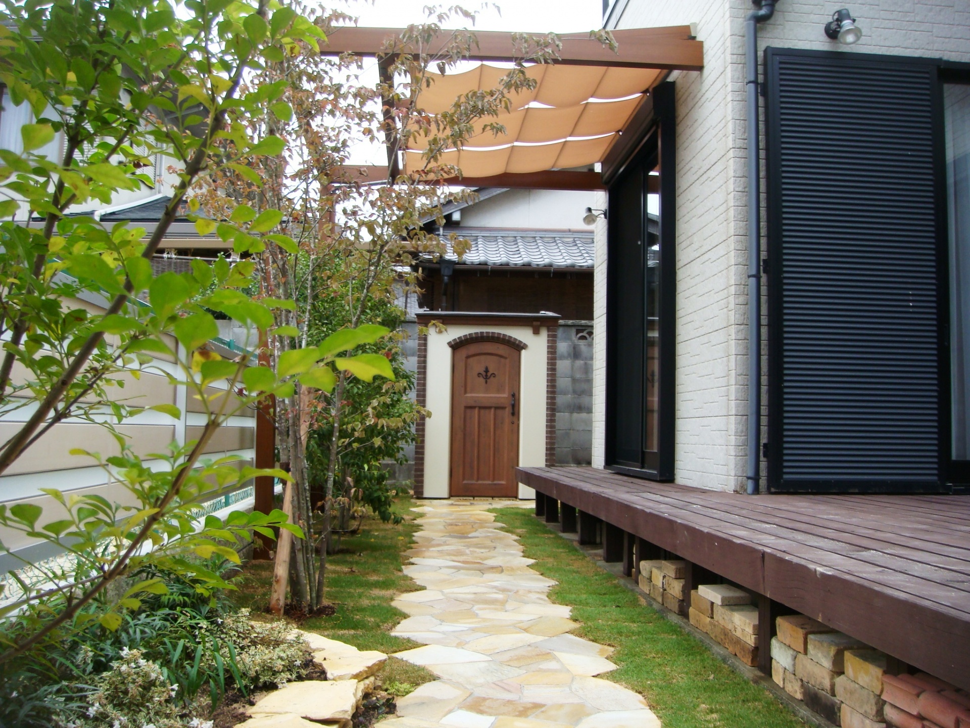 施工実績 相生市新築外構 和モダンエクステリア 門柱はL型に配置しドイツ製ポストがアクセントになっています。ブラックとべージュ色のタイルの組み合わせのデザインとなっています。 アプローチ階段はブラックの300角タイル貼り仕上げ。サイドにホワイトのラインがアクセントになっています。 アプローチは美浜砂利自然石洗出し仕上げ。途中和室前にはイブシブラックのレンガステップと自然石のピンコロの組み合わせです。 庭部はシンメトリーに壁を配置センターにはレッドのコルジルネを植樹。夜のライトアップが実に美しいです。 ウリンフェンスにアイボリーの吹付け仕上げの組み合わせ。レトロランプがやさしい光を放ちます。 和室前の庭も施工させていただきました。御主人お気に入りの庭にしあがり、あまりお手入れのいらないように設計させてもらいました。 お気に入りの和庭。来客者が見えるように階段横のフェンスを低めに設計。 道路からのショット。グリーンもたくさん植樹しました。