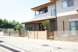 施工実績 姫路市新築外構 クローズスタイルの和モダンエクステリア お客様のご希望は、あまり派手にならないように落ち着いた感じにということでした。ウリンのスリットフェンスを使用し落ち着いた色合いのレンガと塗壁の組み合わせの門柱に仕上げました。玄関サイドには四季を楽しめる落葉樹のトネリコを植樹、ウリン角柱裏にはシマトネリコを植樹しウッドのブラウンと植栽がグリーンをうまく調和しています。 玄関正面のアイストップウォールには、300角のアクセントタイルをデザイン。 玄関アプローチにはホワイトの明るい自然石を 木製のブラウンと植栽のグリーンがうまく調和しています。 庭の部分はこれからお客様が大好きな小花を植え込み楽しまれる空間に。
