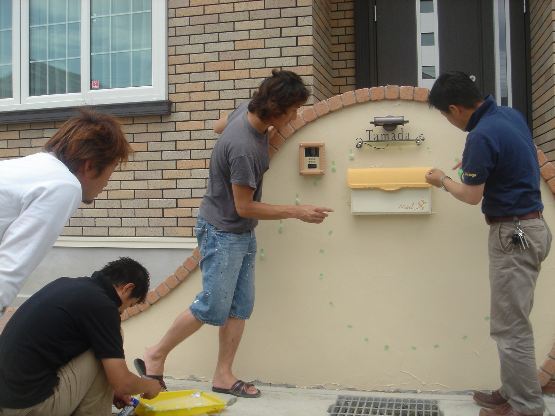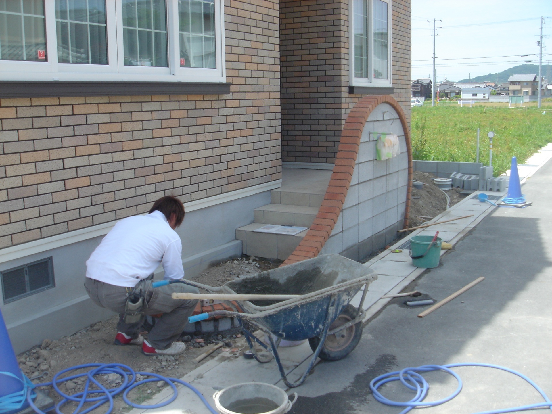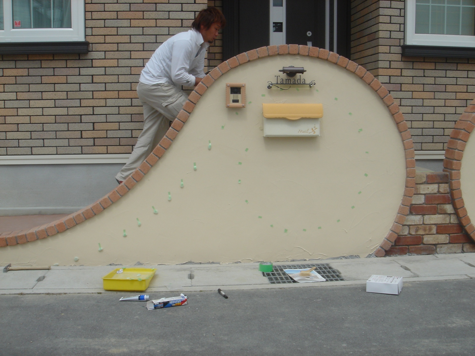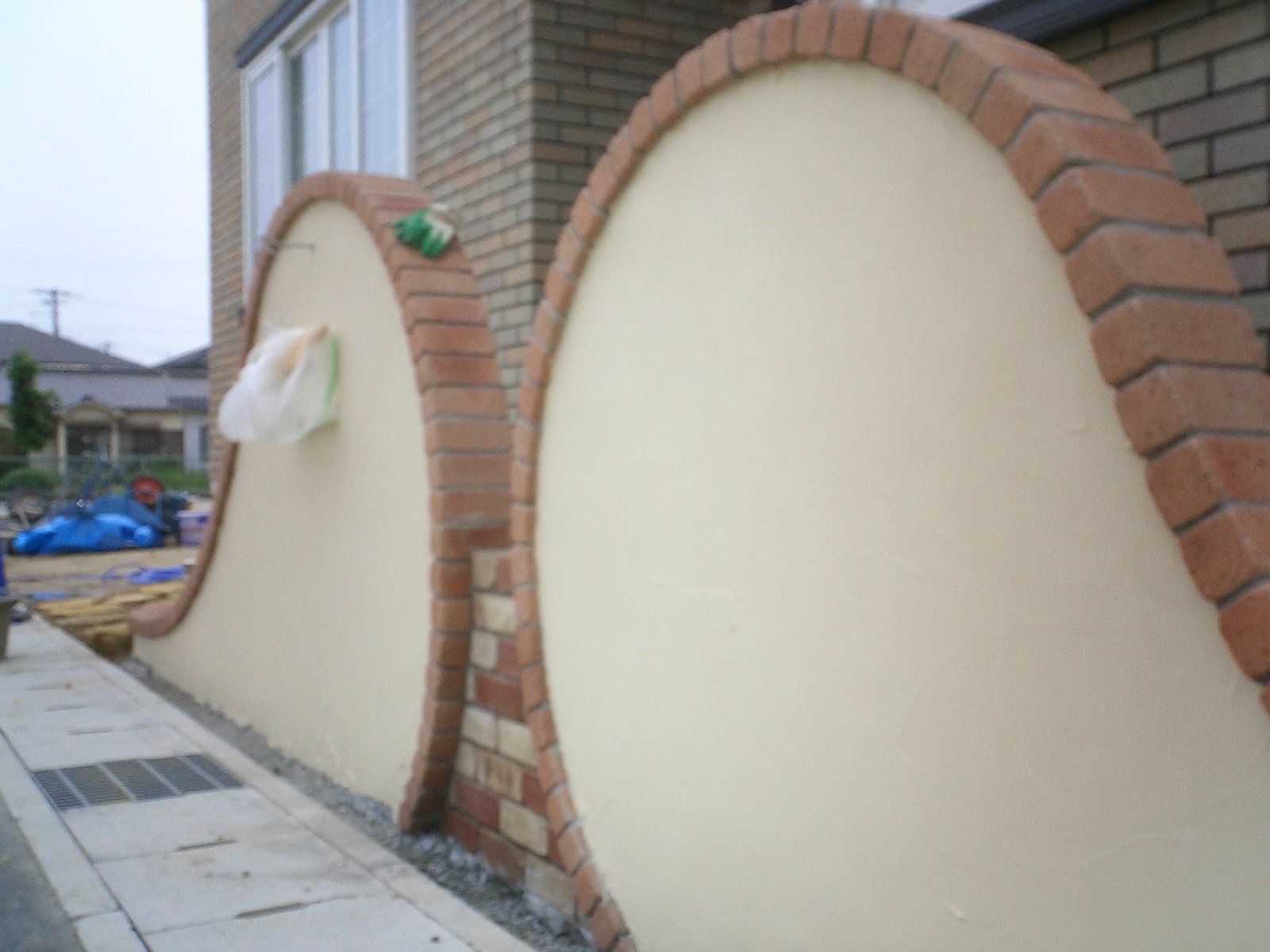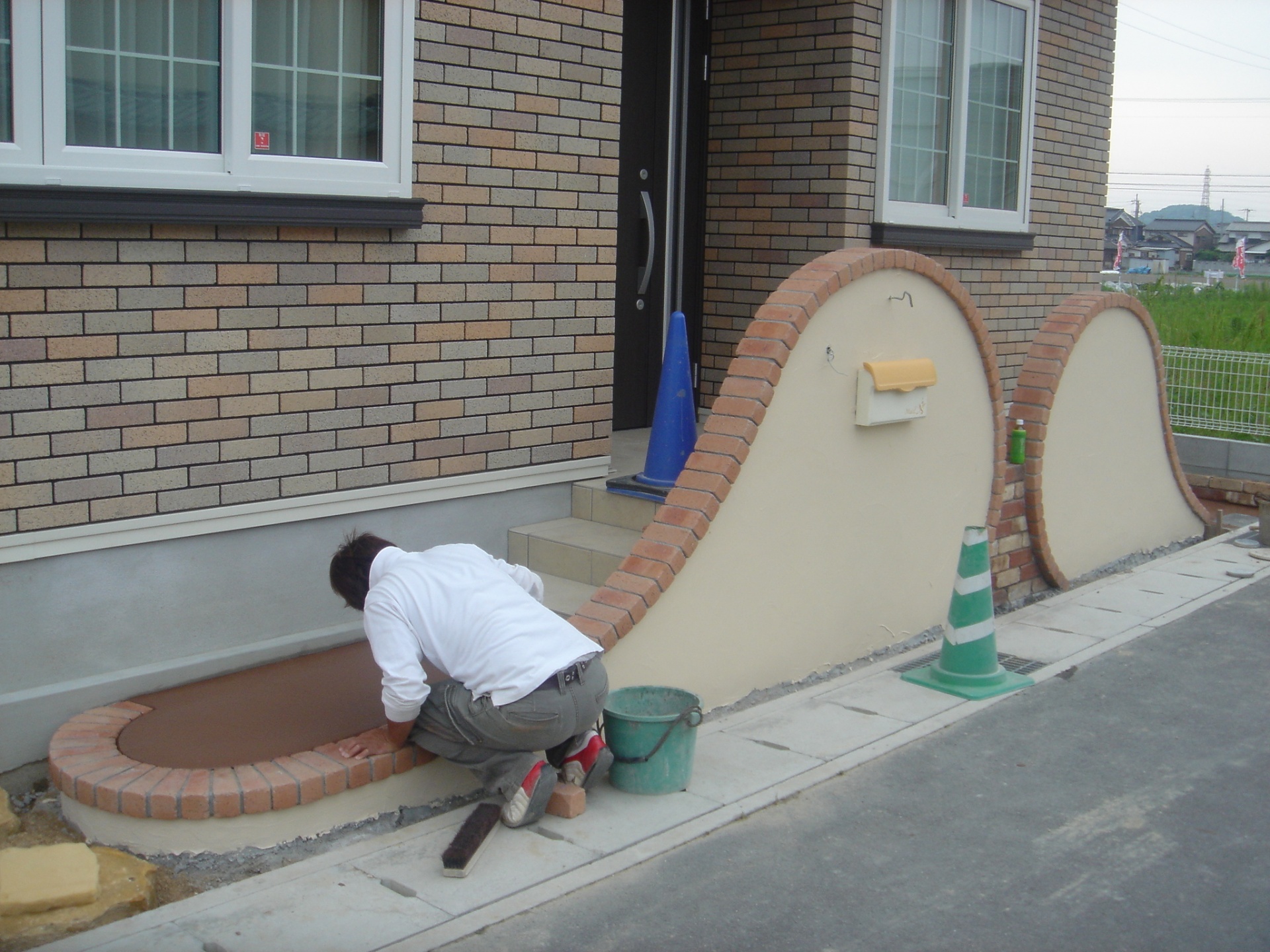 曲線を描いた塗り壁にレンガ笠木をのせアプローチへとつながっていきます。
