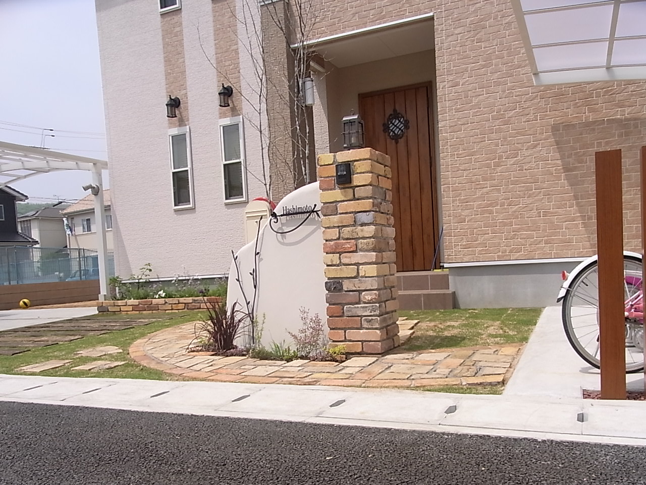 ヴィンテージレンガとアイアンオブジェのコラボしたガーデンエクステリアが完成しました。
