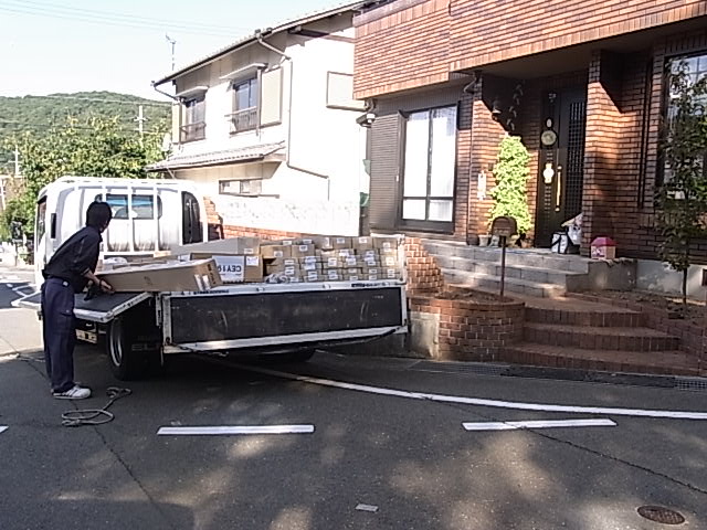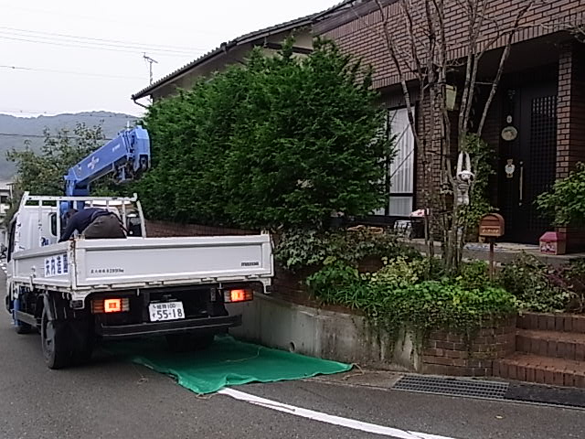 植栽がすべて撤去され中庭のウッドデッキの資材搬入です。