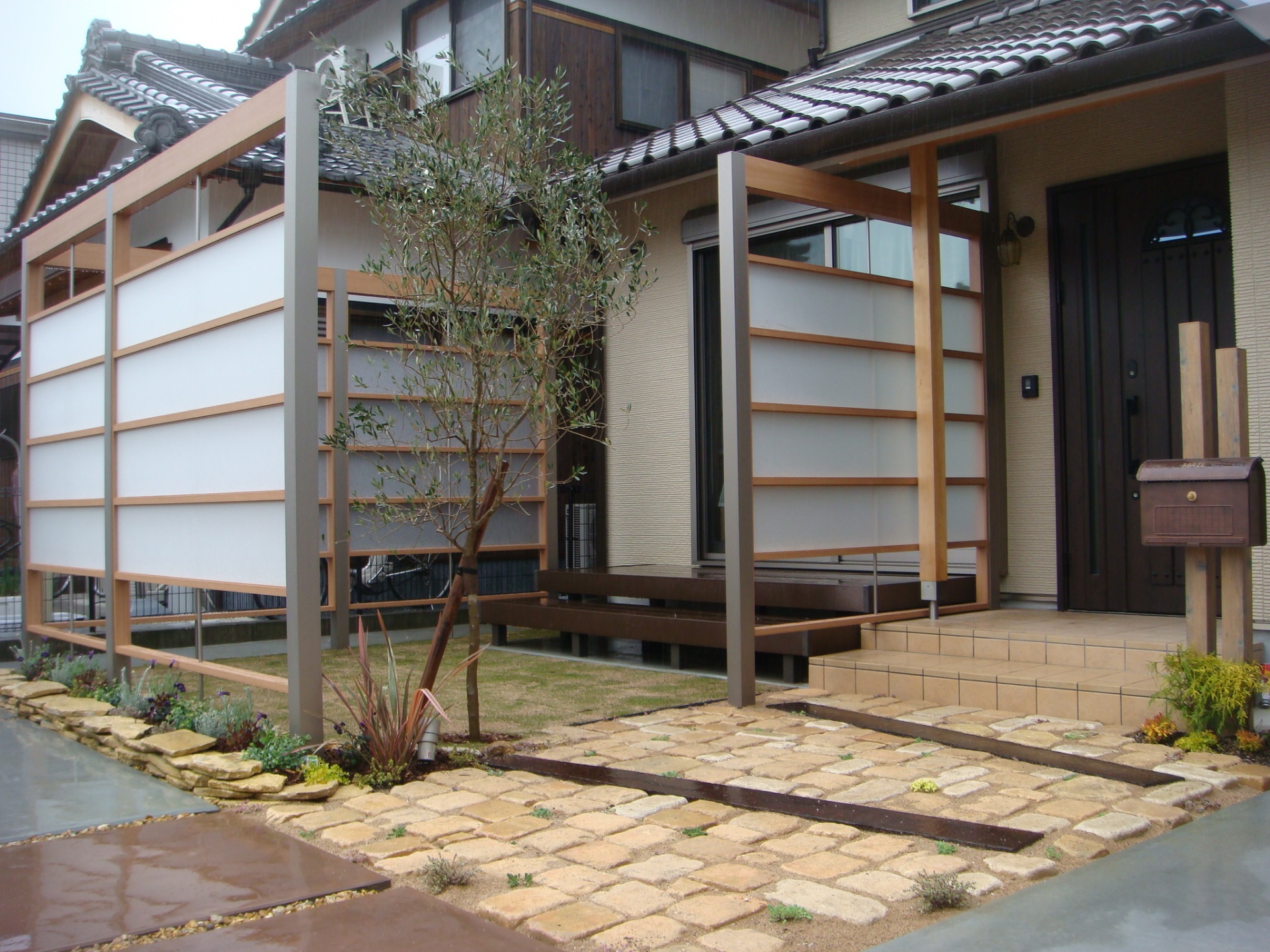 2台分の駐車スペースを確保し、玄関横のリビング前に目隠し、デッキ+芝生を張ってお庭空間を最大限広くとります。