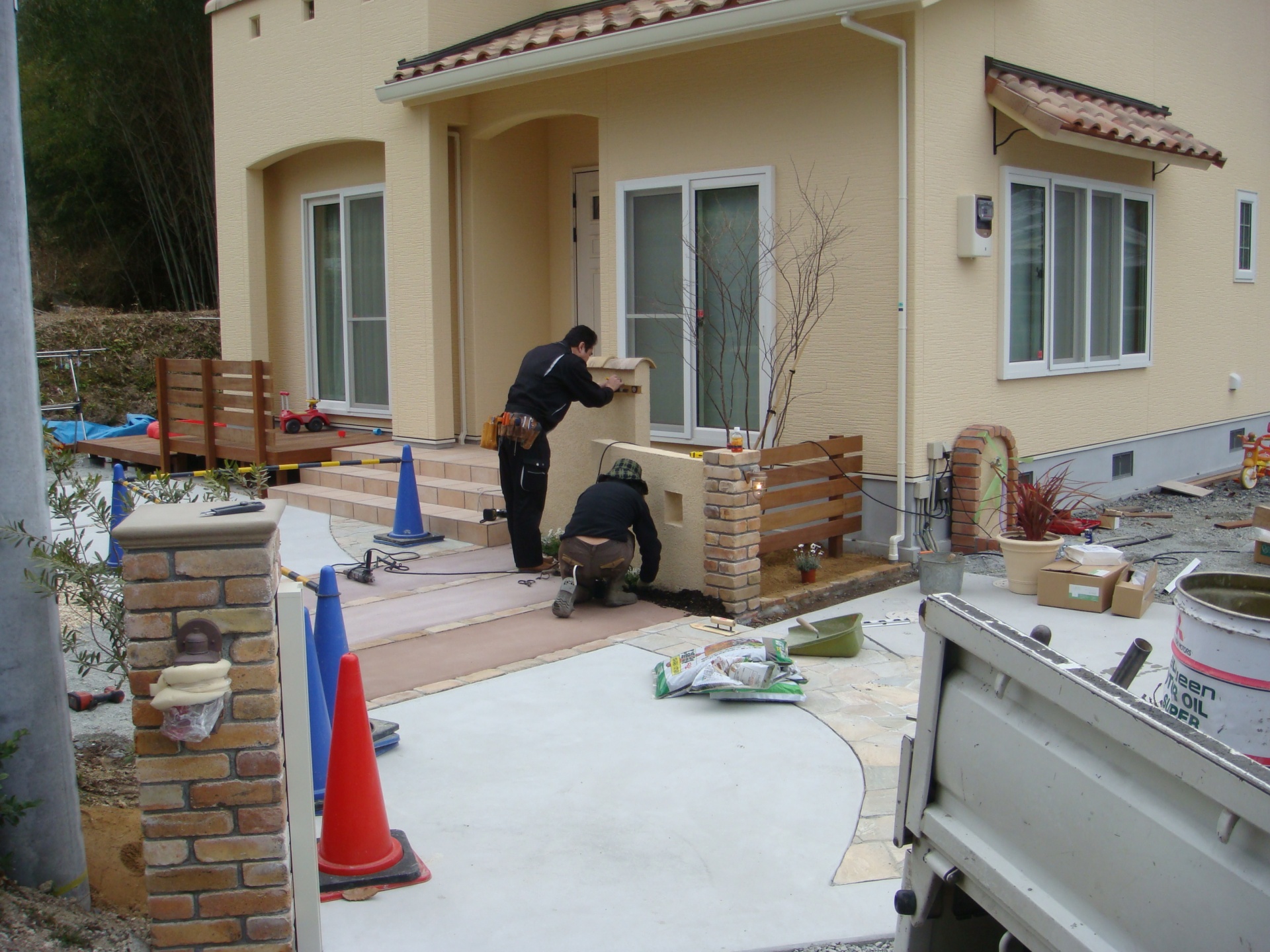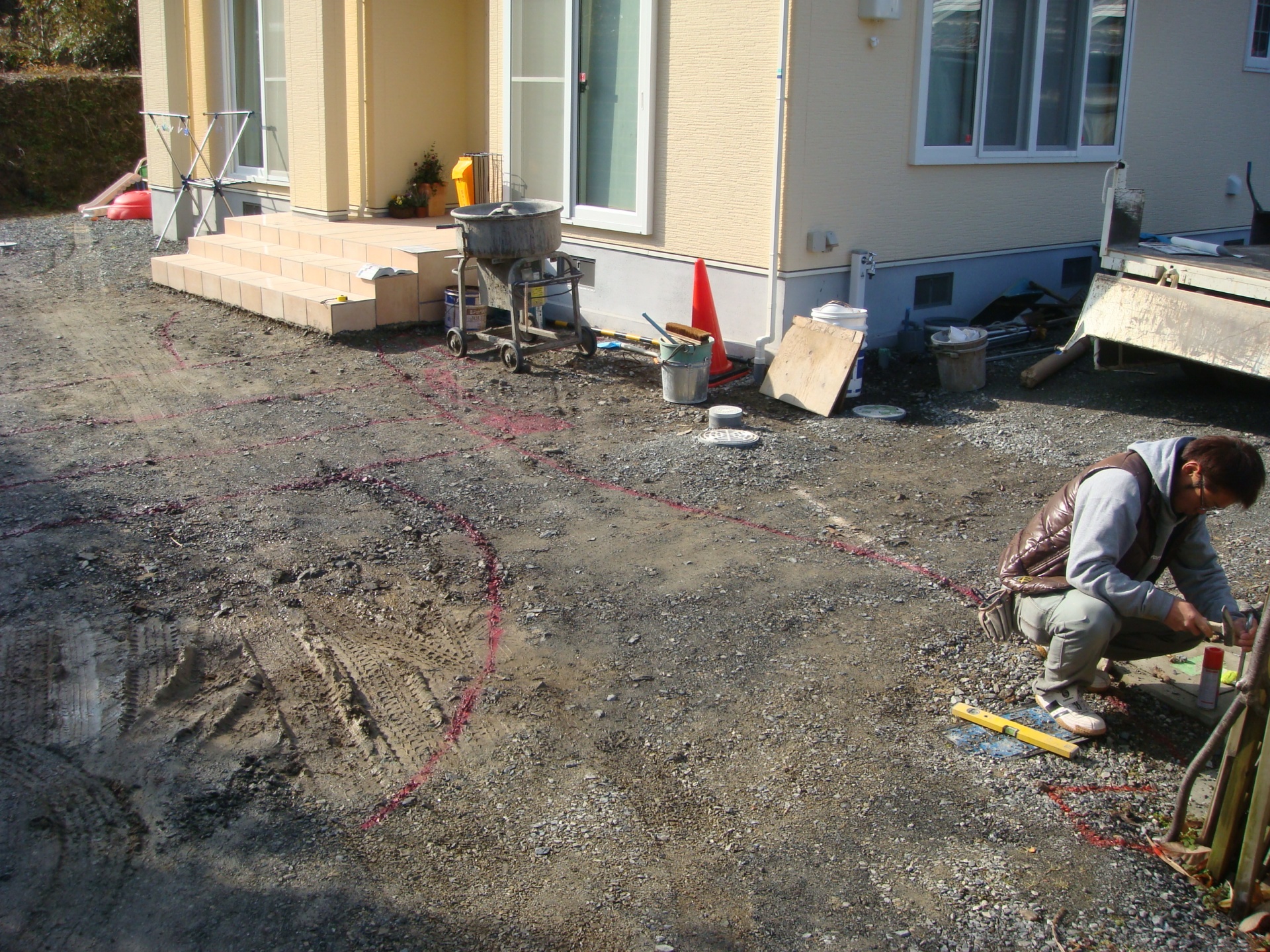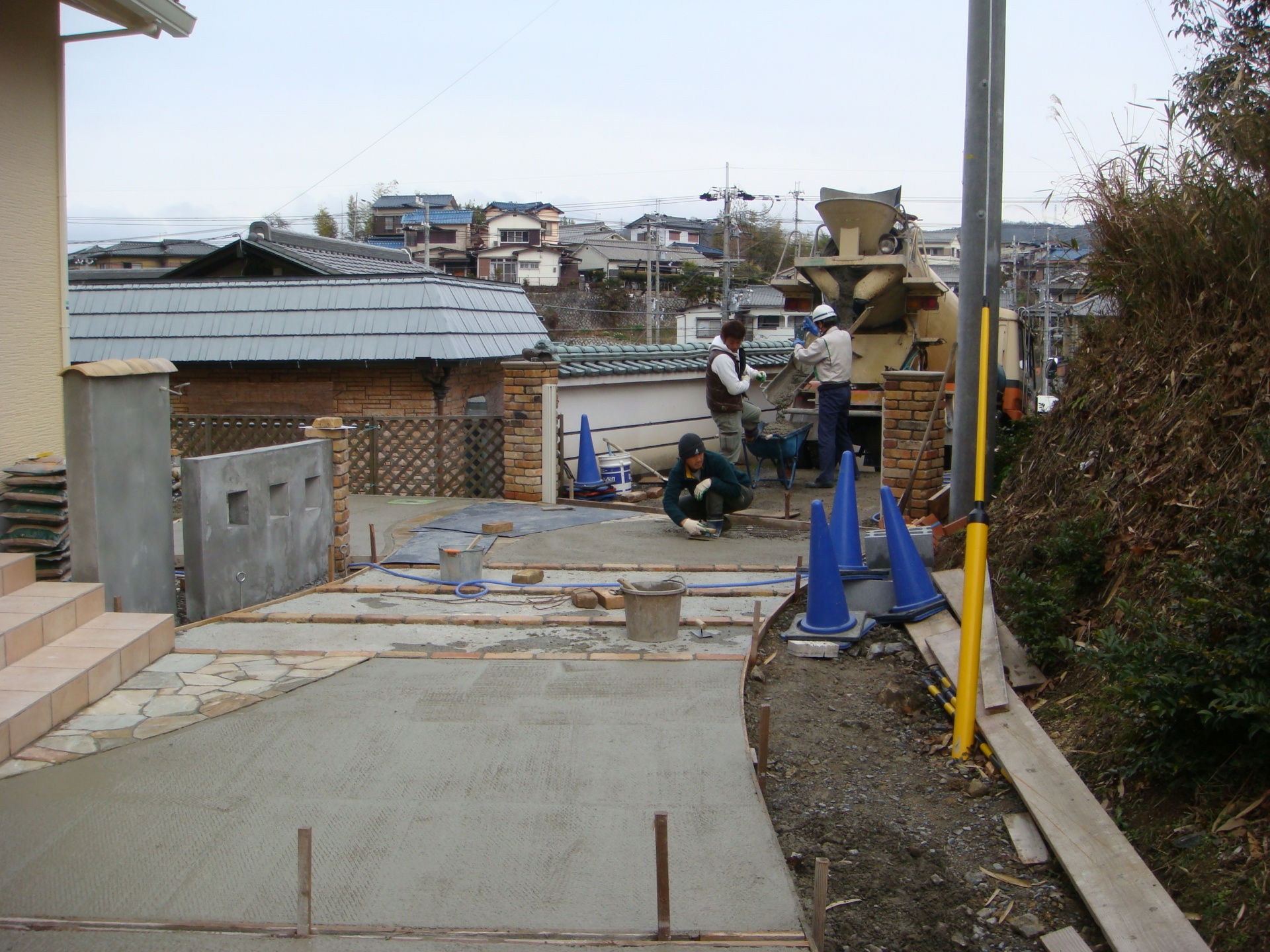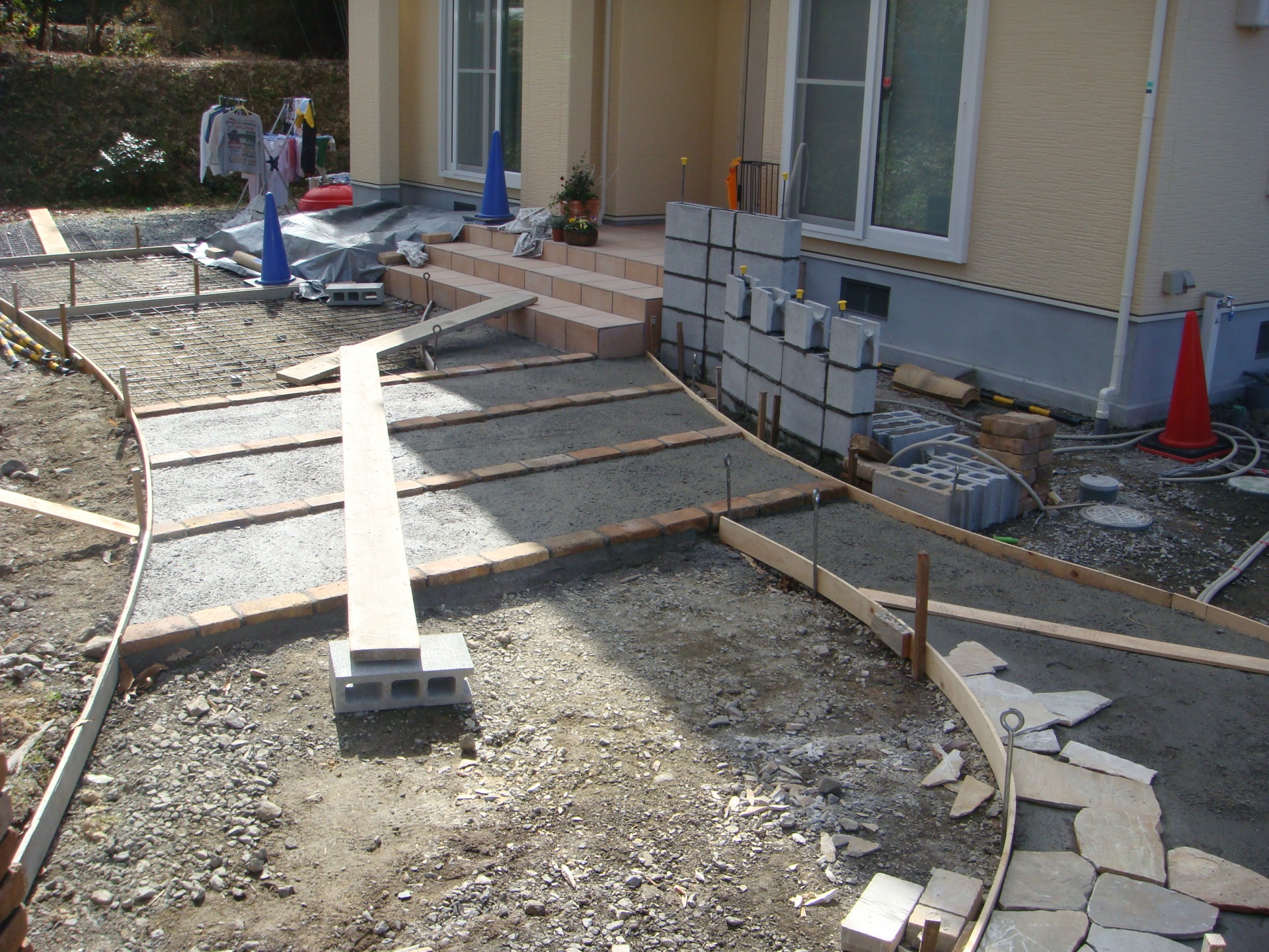 アプローチの下地コンクリートも打ち、仕上げ作業に入っていきます。