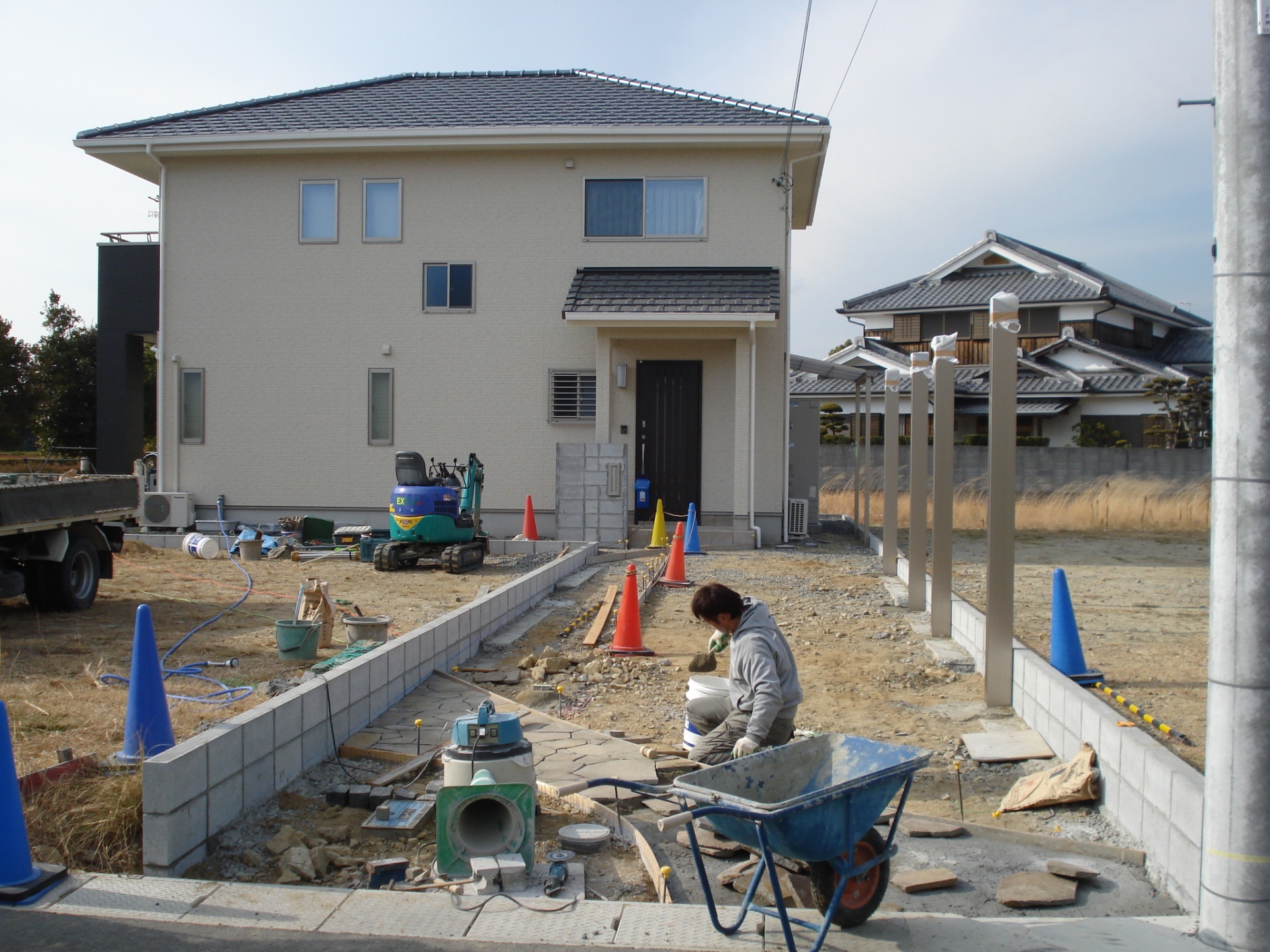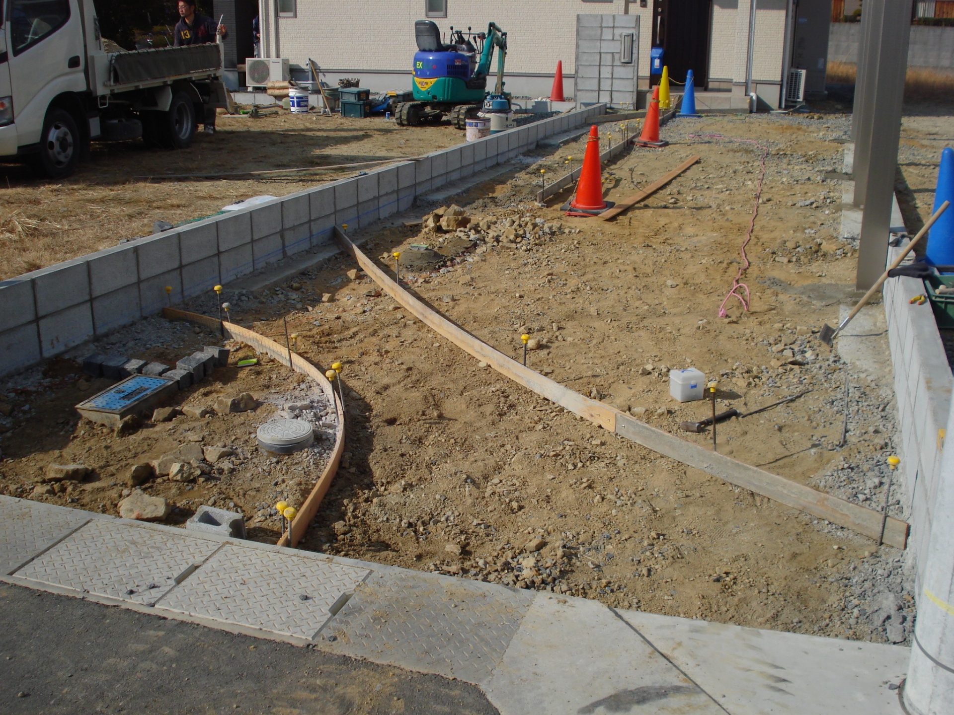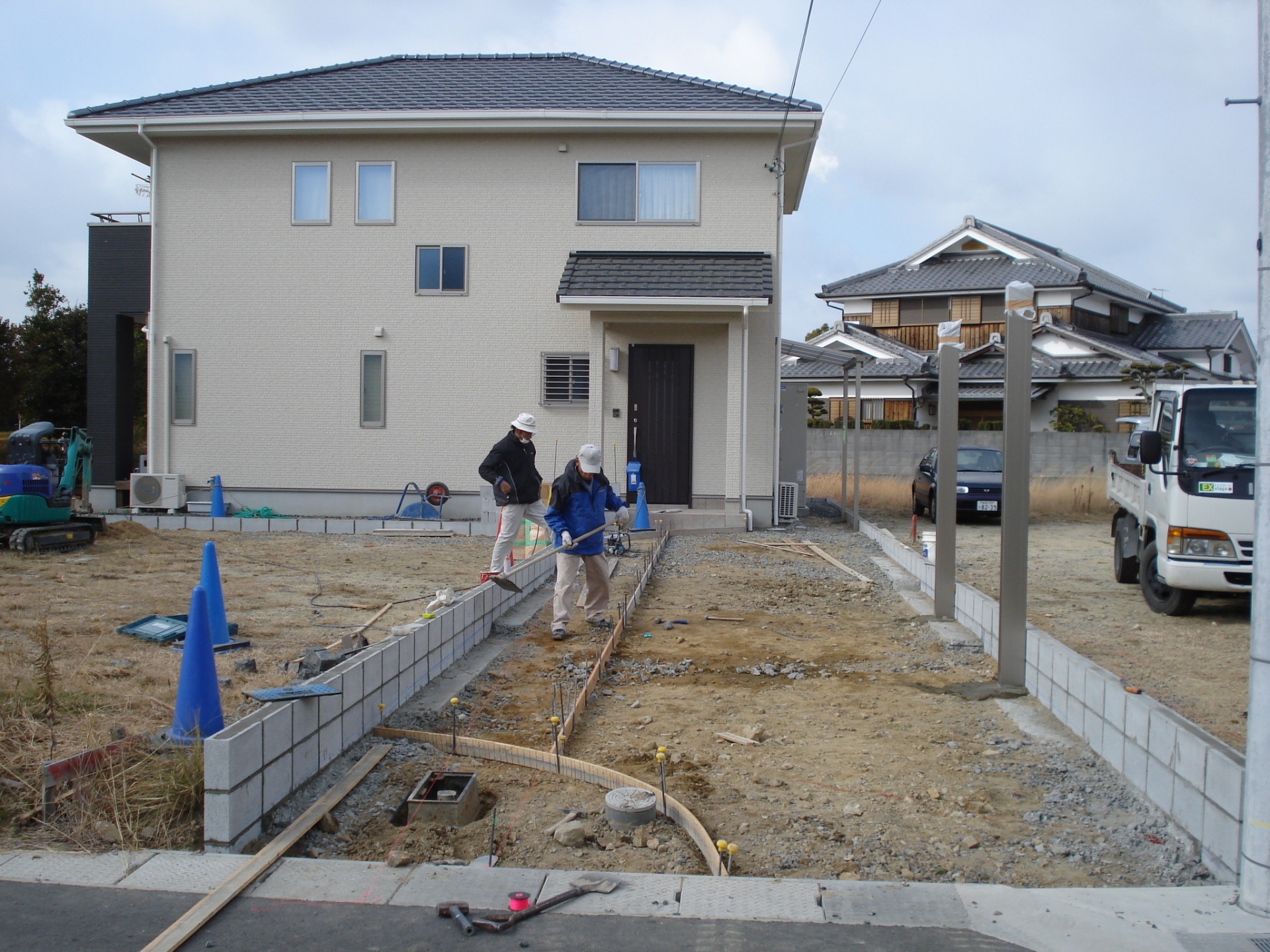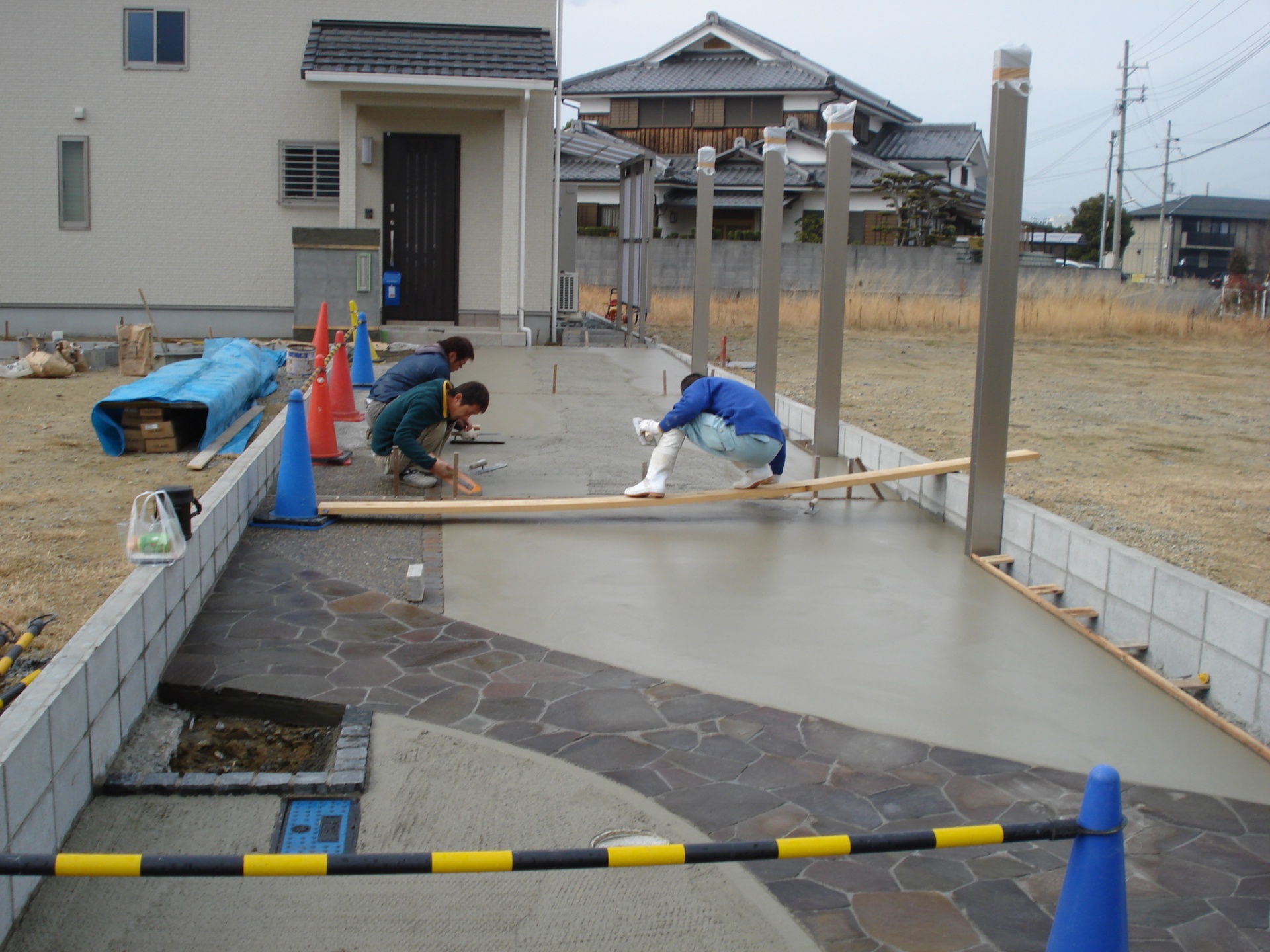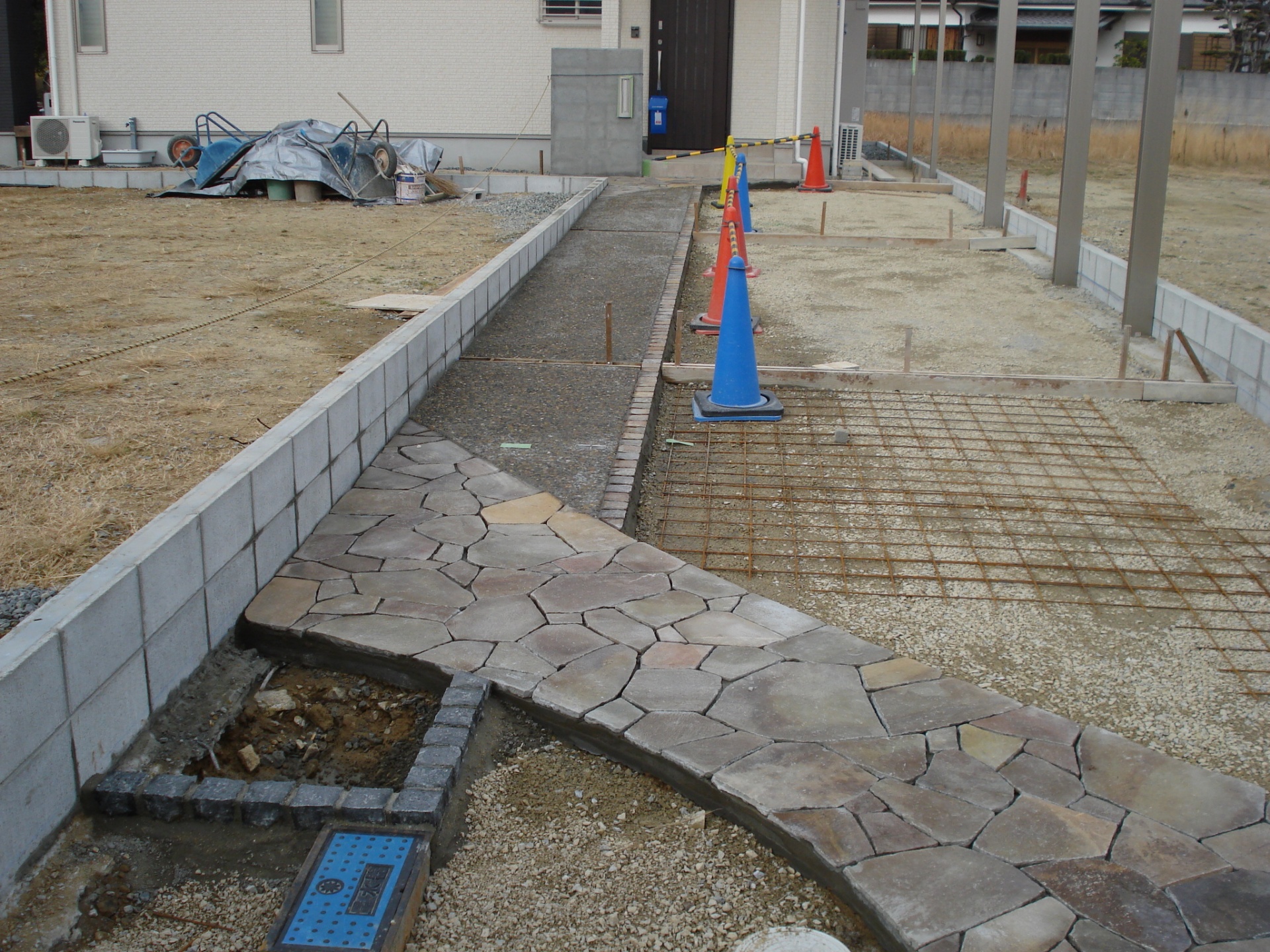 2010年1月着工 赤穂市S様邸 着工前 専用通路が約10.0mありその奥に建物があります。その部分を車を止める為のスペースとしてではなく、お庭の一部として使って頂けるプランを提案しています。 1~4日目 境界ブロック積み 5日目 アプローチ:下準備(止型枠) 6・7日目 自然石乱張り 8日目 アプローチ:洗い出し仕上げ 9日目 車庫:土間コンクリートコテ押さえ 10日目 花壇:植え込み ご家族揃って完成記念 完成しました