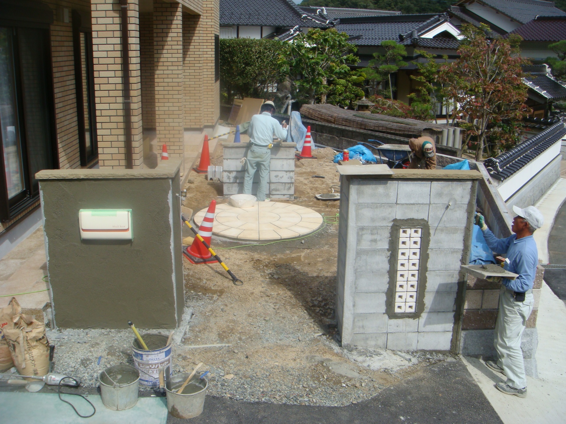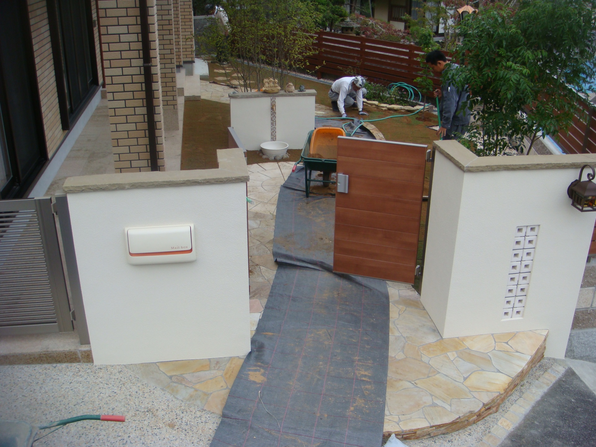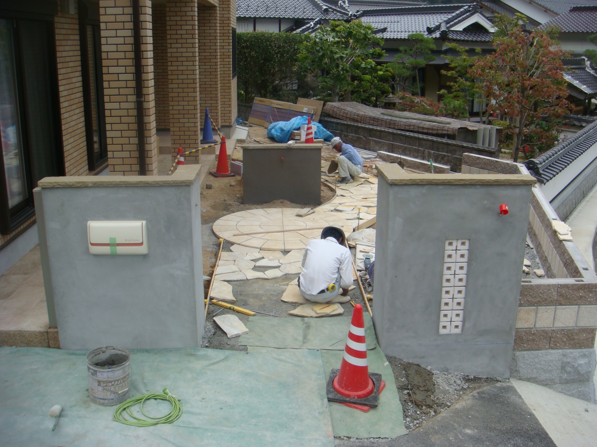 2010年9月着工 たつの市H様邸 着工前 たつの市H様邸 門周り工事です。マーキングでお客様にご確認していただいた後着工です。 1~4日 下地のブロック積み~下地モルタル 中央の自然石サークルも据えました。 5~8日 アプローチの自然石乱張りです。豪華な仕上がりになっていきます。 9日目 吹付け塗装工事。 10日目 植栽工事です。真砂土を入れ芝生を張っていきます。植栽も入ります。 完成 芝生の緑が鮮やかなお庭になりました。 その他完成写真はこちらです